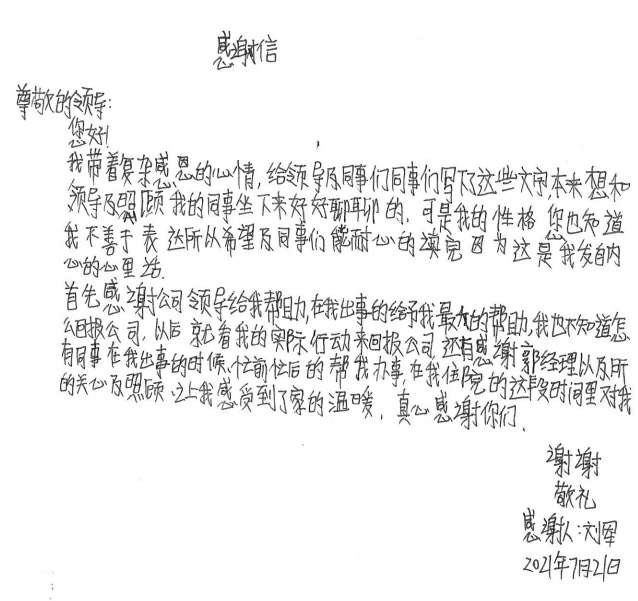 经过半个月治疗休养,刘军手部已无大碍。出院后的他写了一封感谢信并为公司送了一面锦旗,他说道,是开云·官方网站页面登录入口-开云online(中国)这个大家庭让他感受到了关怀和温暖,他表示要把这种关怀变成工作上的动力,争取早日返回工作岗位,努力工作,回报大家的关心和关爱。